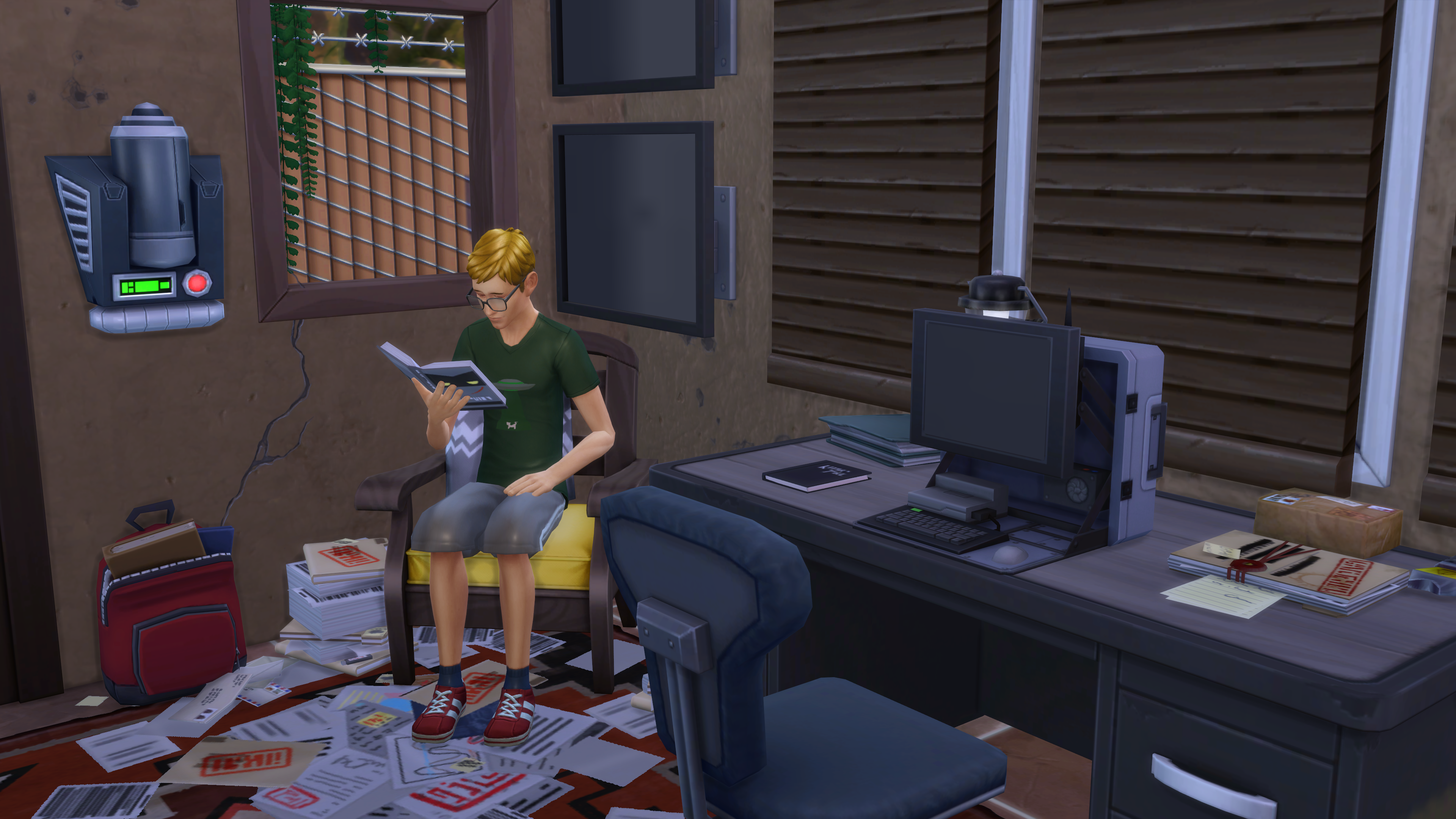 “This doesn’t look good,” Ned thought to himself. “Something has gone terribly wrong.” Ned spied a journal on a crate. “Makeshift quarters of the pilot, I’d guess. This notebook might have some clues.” Picking up the black notebook, Ned decided to get out of the bunker. The back of his neck prickled, and Ned slowly turned around. “Well, I think I know what happened to the pilot.”