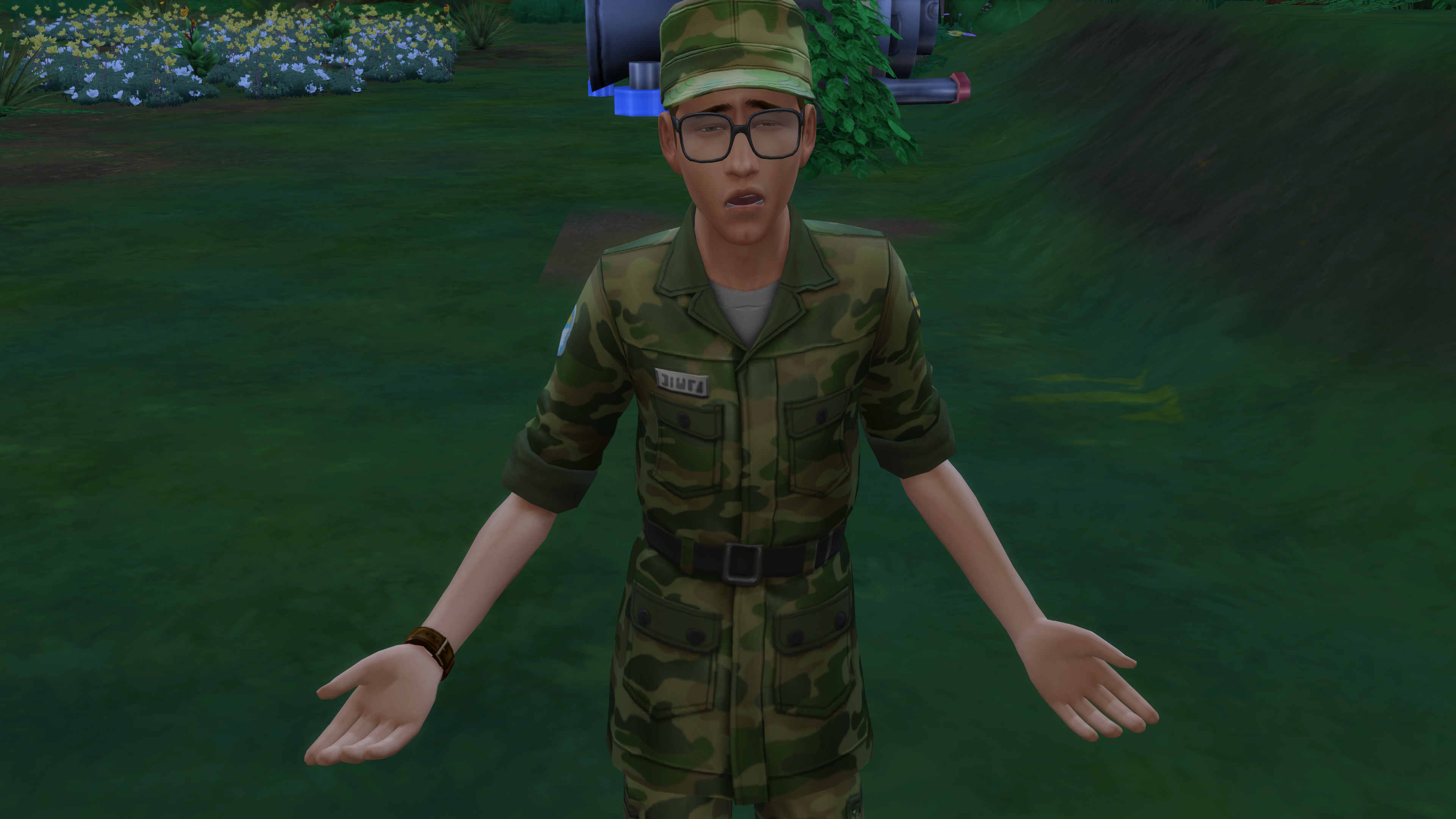 The shadows of the trees were closing in when Ned hiked up the hill to the cargo bay. There, beside what he assumed were items the crew was attempting to pull out of the wreckage, Ned discovered the dossier. He put it in his pack and headed back down the hill, pausing as a swarm of bees closed in around him. Ned stood motionless until they flew off, and then made his way down the hill.