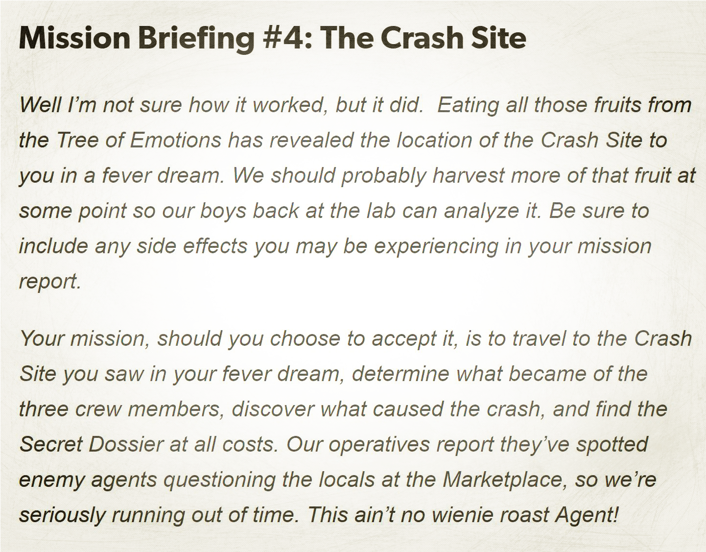 Still feeling some of the effects from the berries, Ned did a quick workout and then sat down to finish Mischief for Agents: The Long Con until his handler responded. Ned didn’t have to wait long; he had just read the final words, “Deny everything,” when he heard the notification.