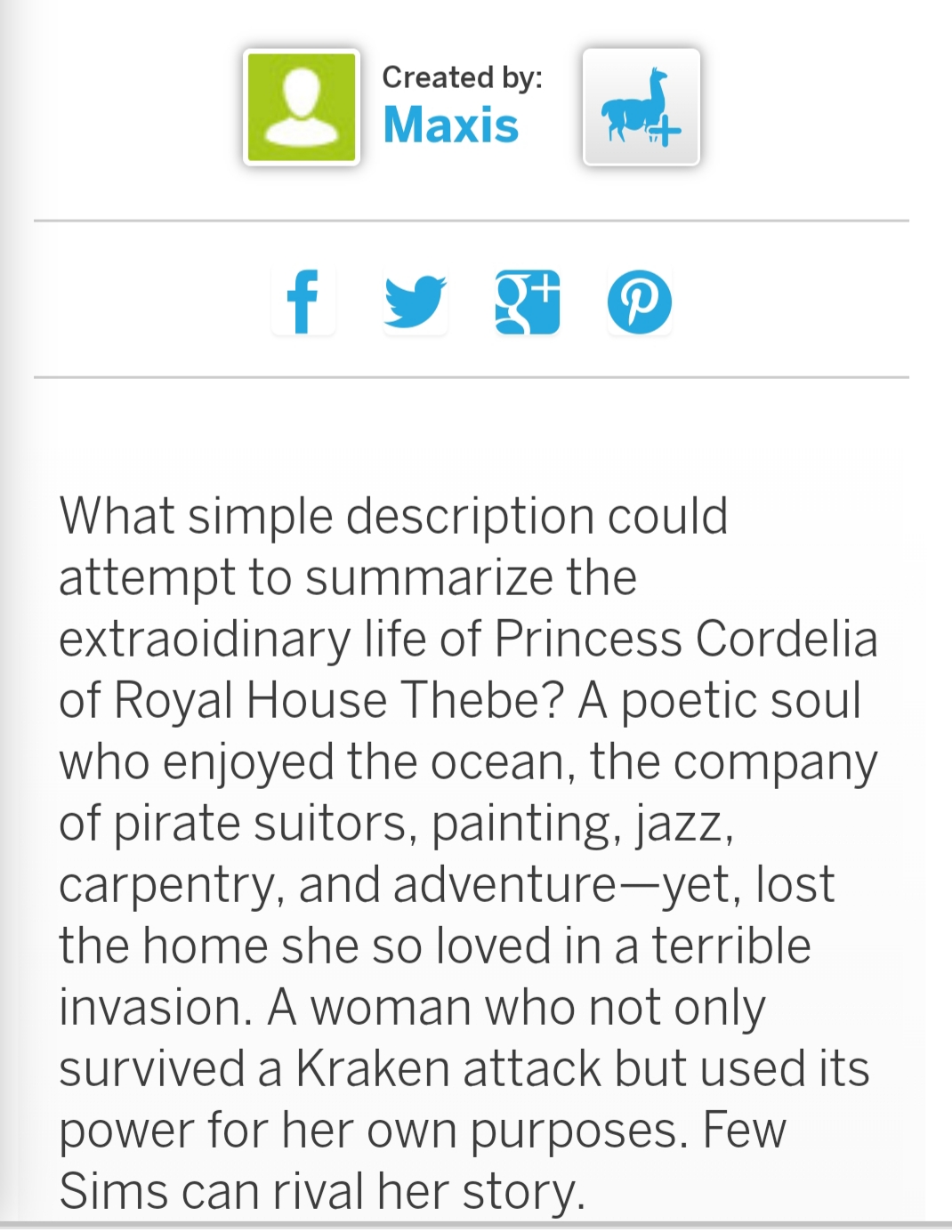 What makes this especially exciting for me is that earlier today I discovered Princess Cordelia and Co. had been uploaded to the Gallery by SimGuruMorgan. The description gives additional background to this amazing Sim.
