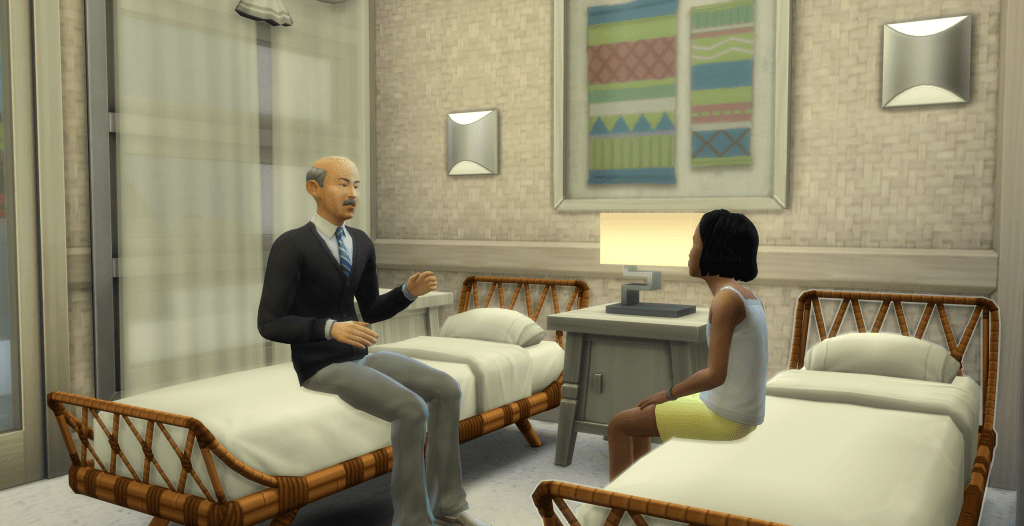 Dennis Kim. Elder. Sad puppy eyes. Down-turned mouth. Sloped shoulders. He looks defeated. What is this sim’s story?