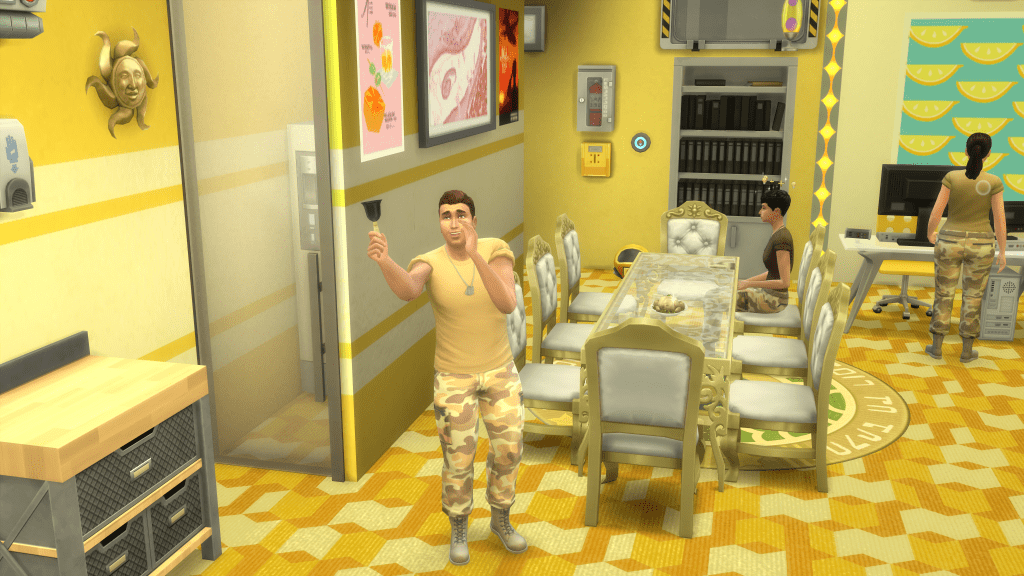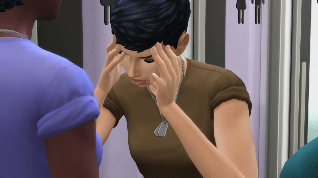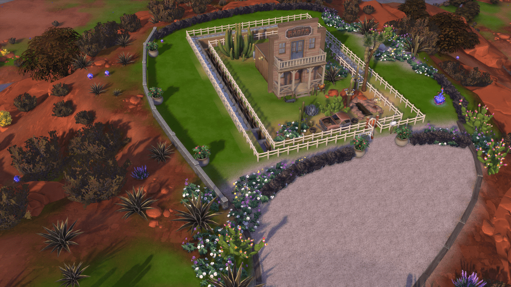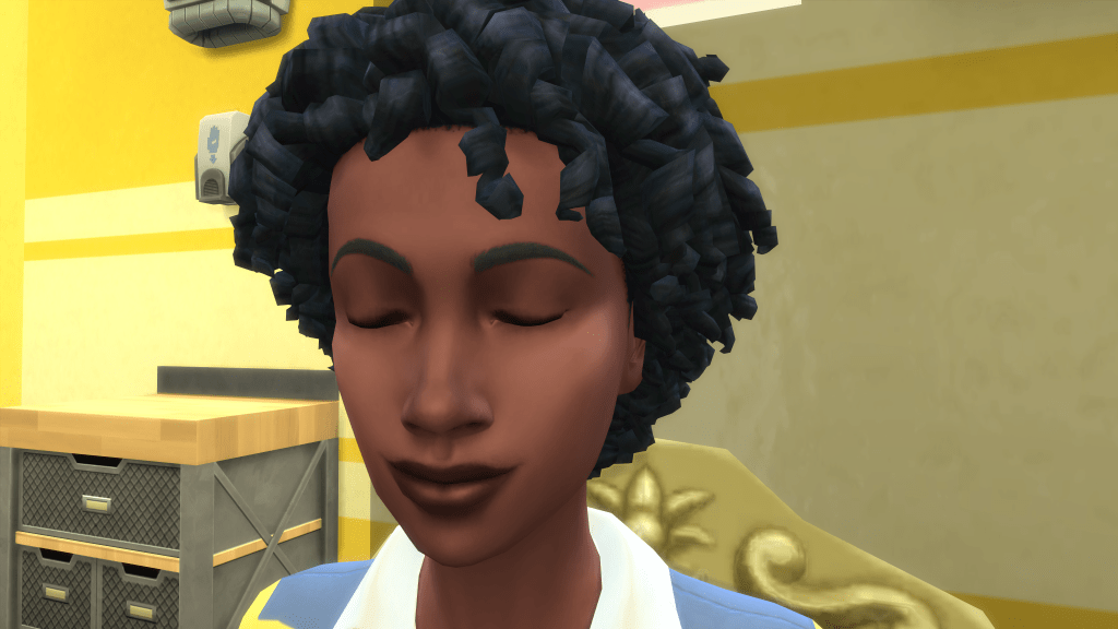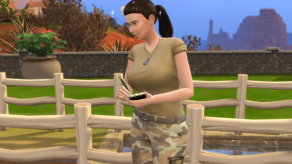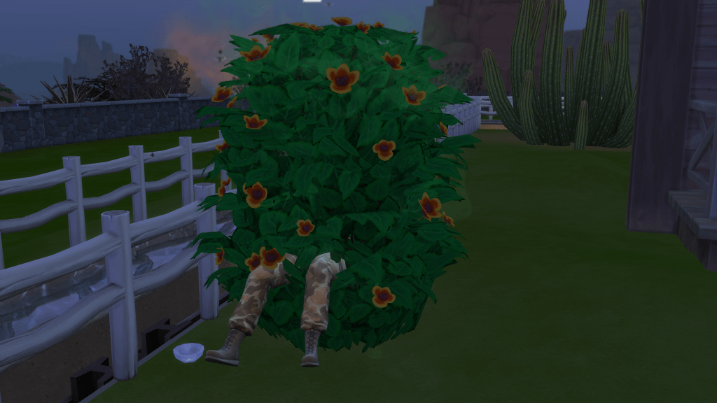 Watcher’s Note: I’ve been playing on Speed 3 (fast) and just observing, taking screenshots if I see something interesting. I was watching as everyone enjoyed their Harvest Fest meal and went upstairs to see if any gnomes had spawned. It was then I realized somehow Haylee Frazier had sneaked outside and was wandering around outside of the lot! Before I knew it, she was “researching” the bizarre plant that must have spawned on the lot. I was a bit perturbed so placed a Selvadoradian bush for her. She must have also sneaked food because I saw an empty bowl (next to her boot!). For such a “good” sim, she certainly is a trouble maker. She nearly caught the place ablaze when I forgot to lock the door after Jayceon cooked; I’m thinking I may have unlocked the door during the fire so they could route to safety and that’s how she escaped.